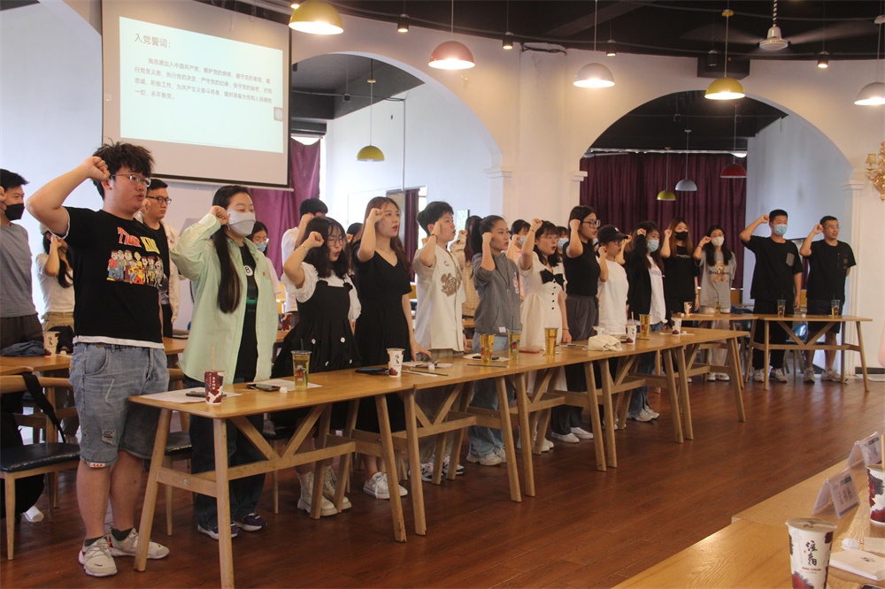 郭峰寄语毕业生时提出,同学们在未来的工作岗位上不要忘记入党初心,应时刻牢记党员身份,积极服务奉献社会;学院永远是同学们最坚强的后盾。最后,参与活动的全体师生集体起立,共同重温入党誓词。