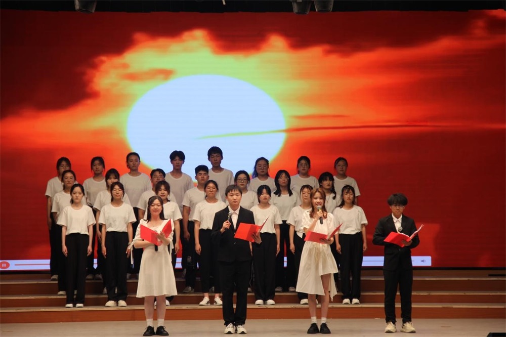 朗诵伊始,纪思羽饱含深情歌唱《我和我的祖国》,清澈的女声清唱在礼堂上空盘旋,将观众迅速代入情绪;紧接着,悲壮又充满力量的背景音乐响起,领诵人铿锵有力的语言、昂扬的语调诉说着那个年代的故事,诵出了祖国一路走来的路程,“那一年,李大钊30岁、毛泽东26岁、蔡和森24岁...... ”描述了中国过去的贫困和人民千百年来的梦想与苦难,回味良久,不能忘怀;随后,全体学生的合诵将全场的气氛推向顶峰,展现了新中国的崛起和新生,深情地抒发了对祖国的热爱;在朗诵的最后,全体学生高喊“这就是我们的青春中国!”向大家庄重而深情地抒发着内心饱满真挚的爱国激情,昭示着新中国已傲然崛起于世界东方,屹立不倒、经久不衰。