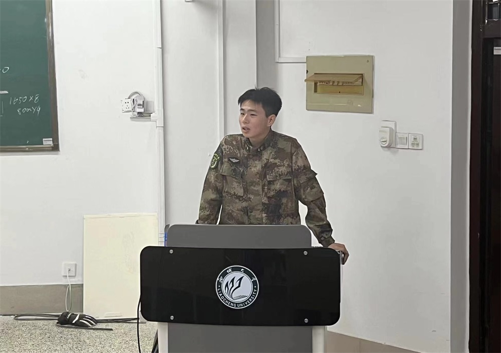 王献可则根据军训教导营的选拔规则及考核方式、军训指导营的主要工作内容、日常训练等方面展开讲解,他提到军训教导营的选拔标准是需要学生具备较好的政治素质和思想品德,组织纪律观念强,积极向上,乐于奉献。