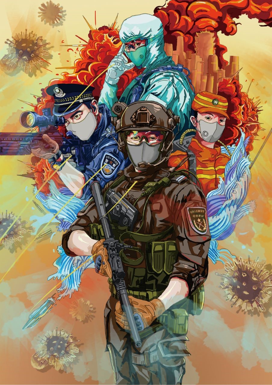 作品简介:橄榄绿、守护蓝、天使白、志愿红……英雄的“逆行者”们从五湖四海汇聚到武汉,誓击倒病毒的狂妄!画面中的人物是军人、警察、医生、环卫工人,他们朝向四方组成一支队伍,象征从五湖四海集结到武汉的战疫英雄。背景中火光冲天的岳阳楼及武汉城,渲染出武汉疫情的危急,刻不容缓。画面下方象征抗击疫情力量的水浪,呈现向上翻涌的趋势,预示着将背景上方象征病毒势力的火焰扑灭,表现战疫力量必胜!
