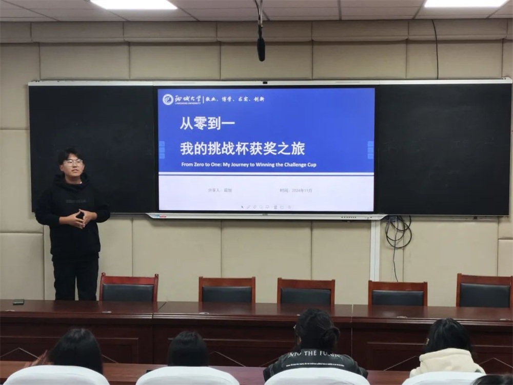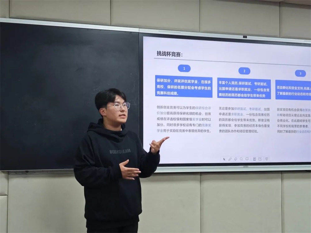 科创青春,梦想启航。活动伊始,田旭向同学们详细介绍了挑战杯竞赛的分类、内容及其重要性。他着重强调了该竞赛在培养大学生创新精神和实践能力方面的关键作用,并深入阐述了从校赛、省赛到国赛各个阶段的特点、要求以及评审标准,使同学们对竞赛流程有了更为全面且清晰的认识。接着,田旭结合自己参加“挑战杯”中国大学生创业计划竞赛的亲身经历,以深入浅出的方式向同学们传授了如何从社会热点、学科前沿以及生活实际中挖掘有价值的选题。他提醒同学们在选题时务必注重创新性、可行性与实用性,避免陷入选题误区。
