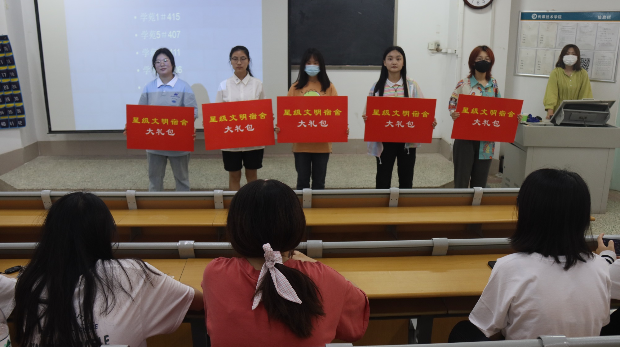 宿舍部同学表示,规范的宿舍管理可以促进学生个人发展,养成良好的生活习惯,它代表着传媒学院优良的宿舍文明风尚,这不仅需要宿管部的严格要求,更需要每一位同学的努力和行动。宿管部以优秀宿舍照片展示,予以同学们学习和借鉴,进一步明确了星级宿舍评选的标准。此次活动不仅展现模范宿舍,还通报并公布较差宿舍名单,在学习优秀模范宿舍的同时,激励较差宿舍向好向上发展。活动进入高潮,宿管部同学为获奖宿舍颁发证书以及星际文明宿舍大礼包,各宿舍代表分组上台合影留念。伴随着阵阵掌声,此次颁奖活动圆满结束。