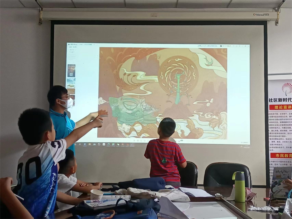 服务队成员张树琨和夏文慧,分别就收集古蜀文明——三星堆文字材料和实物照片,了解到古蜀文明是古代巴蜀地区曾创造过和中原文明有交流融合,却又独立于中原文明之外的本土特色文明,有着自己独特的生活习俗、宗教信仰、传统节日等。此外,实践队队长钱建豪于7月25、26日深入聊城市龙山社区,以幽默风趣的语言为青少年讲解历史文化,在实践中与青少年一起探索趣味的历史文化。