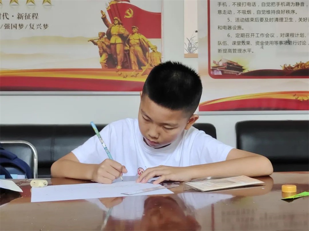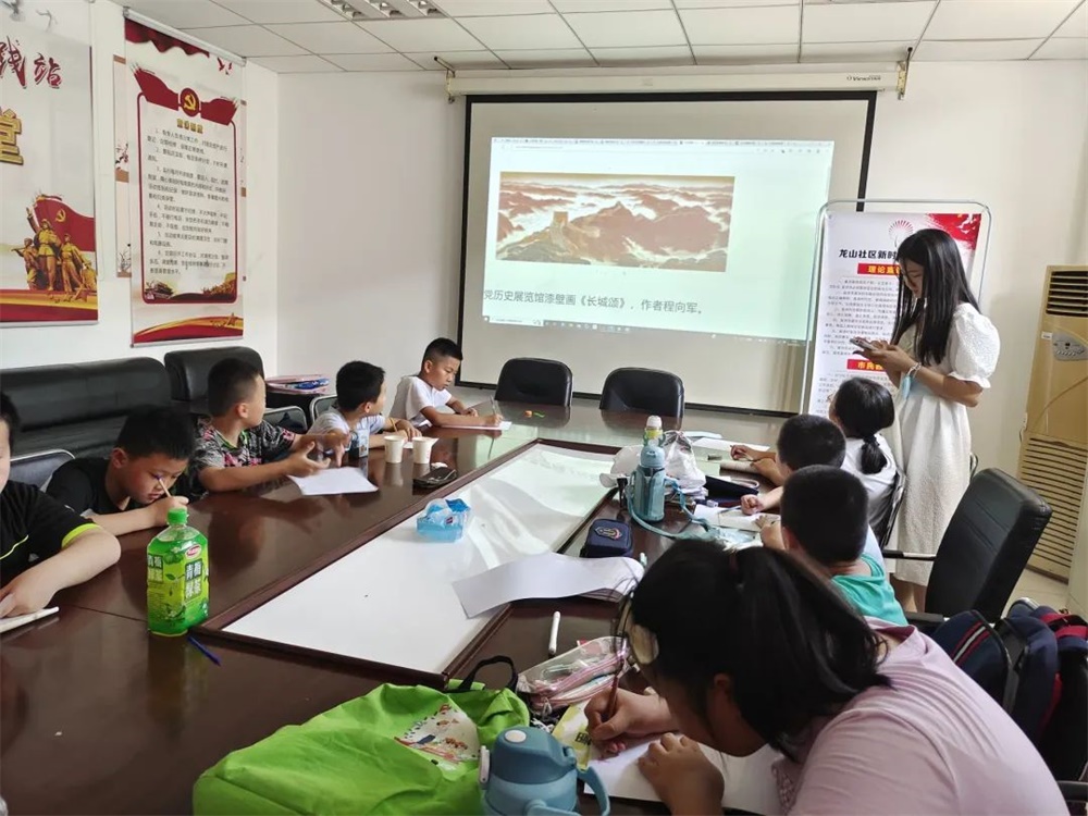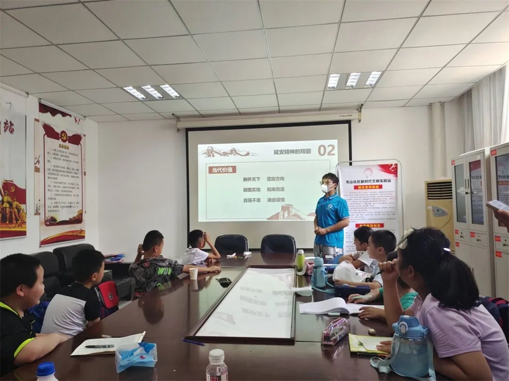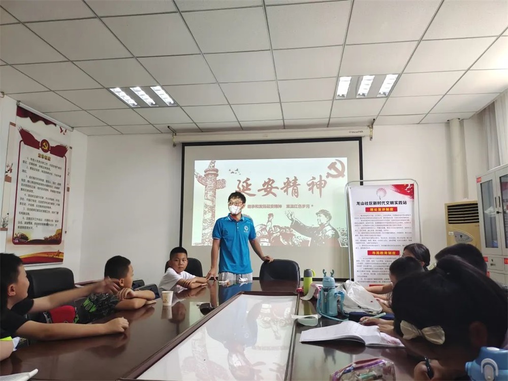 宣讲员缅怀先烈伟绩,结合“PPT”的展示,对同学们进行了党性教育,将孔繁森、杨靖宇等英雄人物的光荣事迹与延安精神结合,深入挖掘其时代精神与内涵,进一步宣扬了英雄人物身上所蕴含的浓厚爱国情怀。服务队成员带领同学们在“动手实践”的环节中,将红色故事内容转化为实践行动内容,开展了“画出红色故事”、“红歌我来唱”等活动,同社区的小朋友一起重温红色历史。歌声中,小朋友们表达了对党与祖国真挚情感,也在歌词中学习到了不畏牺牲、不懈奋斗的红色精神,让红色精神浸润童心,让红色薪火代代相传。