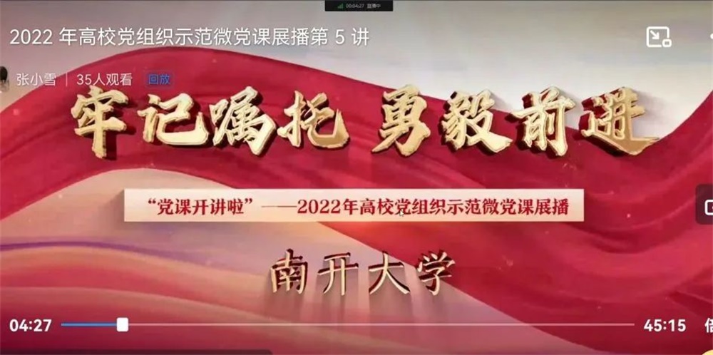 其中,南开大学党委书记杨庆山从答好“爱国三问”谱写时代新篇主题为同学们展开讲解,他提到南开人的报国情怀是代代相传的,南开大学始终坚持以习近平总书记的指导为指引,学习贯彻习近平总书记来校视察重要讲话精神,始终秉持“文以治国,理以强国,商以富国”理念,不负习近平总书记对百年南开的高度重视和殷切期望,不负厚爱重托,将“爱国三问”一代一代问下去,答下去。通过观看本次微党课,全体本科生党员纷纷表示未来将从小我做起,为大我担当。直播结束后,所有党员上传观看照片并在线上进行交流,分享感悟。