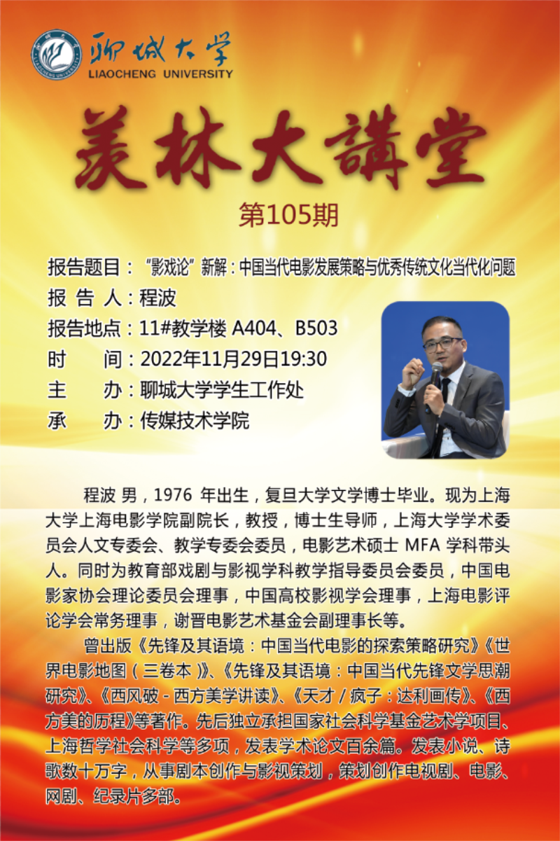 第105期“羡林大讲堂”以线上形式开展。活动特邀上海大学上海电影学院副院长、教授、博士生导师程波作题为《“影戏论”新解:中国当代电影发展策略与优秀传统文化当代化问题》的报告。本次报告会由蜜桃直播