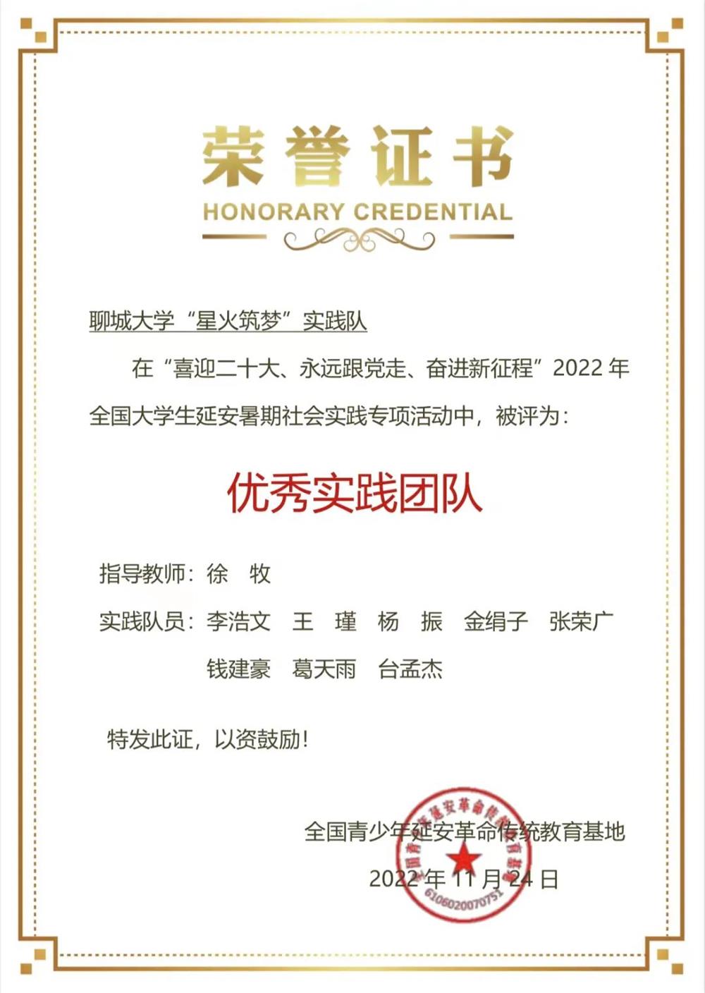 在2022年全国大学生延安暑期社会实践专项活动中,荣获“优秀实践团队”称号;实践队员张荣广荣获“优秀学生”称号;教师徐牧荣获“优秀指导教师”称号,并得到全国青少年延安革命传统教育基地的高度称赞。