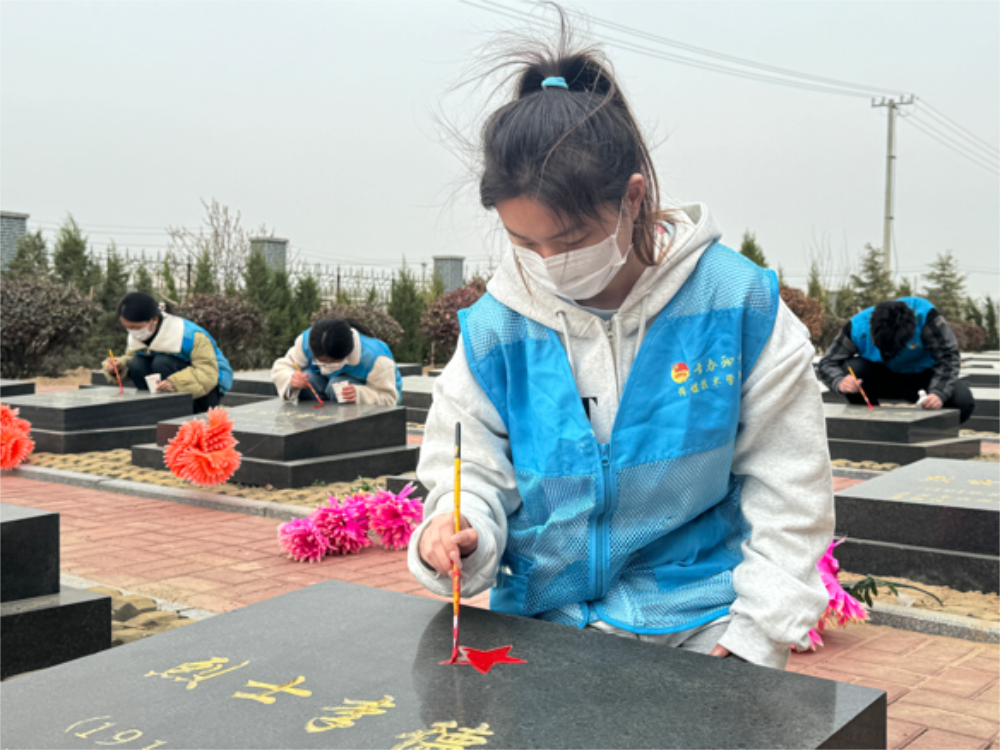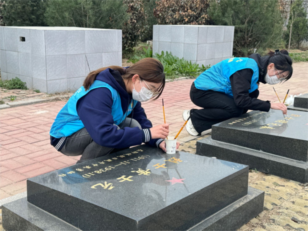 在烈士墓区,成员们列队来到英烈墓碑前,自发向烈士墓行肃穆礼。随后,志愿者们分组有序地开展碑文残漆清理、碑面清洁、饱满描金等一系列工作。每位成员俯身埋头在烈士墓碑前,仔细擦拭墓碑,去除微尘,手持毛笔,一笔一划地将每座座墓碑上的字迹描画清晰,每一次的描摹,都饱含着对烈士的深切缅怀和崇高敬意。活动结束后,宋腾飞同学在谈及感受时提到,每一座墓碑都是一段难忘的英雄事迹,描画墓碑的过程不仅是与烈士们的心灵交流,更是作为当代大学生对革命精神的一种传承。