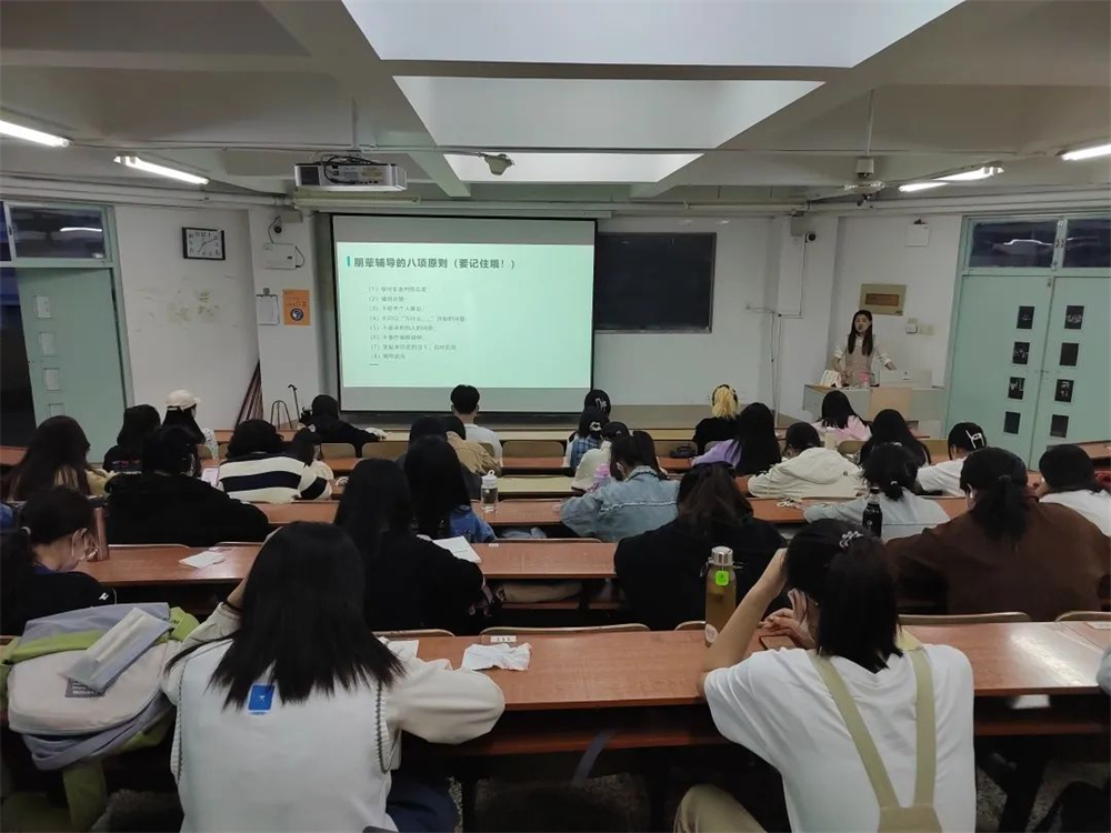 心理部部长曲家谊、干事郑金铭主讲。首先,曲家谊为参加活动的同学们介绍了什么是朋辈心理辅导,使同学们能够明确朋辈心理辅导的概念,从而能够在接下来的学习中更好地理解和掌握。接着,曲家谊又讲述了同学们在进行朋辈心理辅导时需要注意的问题和需要掌握的方法,带领同学们了解了我们大学生在日常生活中常见的问题和具体的表现,引导同学们能够及时且积极主动地去帮助自己身边的同学、朋友,为构建我们蜜桃直播