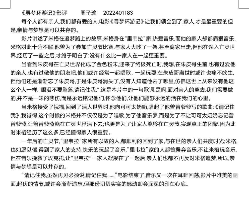 电影因其传达的感情而拥有独特的魅力。此次周末影院活动为同学们放映了经典的心理治愈动画影片——《寻梦环游记》,这步影片以动画的轻松视角探讨了生存与死亡这个沉重的话题。死亡不是永别,忘记才是。在此次活动中,同学们按时到场观看,现场气氛安静有序。影片中不乏欢声笑语,但同样有发人深省的感人结局,让同学们潸然泪下。《寻梦环游记》作为一部治愈电影营造了心理健康教育氛围,提升了学生的个人素养和艺术鉴赏力,使学生在重温经典心理影视作品、领略电影魅力的同时,感受到了积极向上的精神品质。同学们带着满满的收获结束了此次活动。