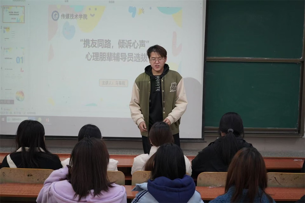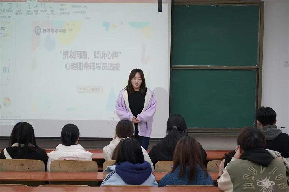 拉近心灵距离,书写青春华章。活动伊始,主讲人马菲阳向在场同学介绍了选拔朋辈辅导员的目的与意义,她指出,朋辈辅导员应在同学之间发挥心理支持作用,帮助他们更好地应对学习和生活中的各种挑战。同时,她还强调了此次活动的选拔流程与评估方法,确保活动的公平、公正、公开。