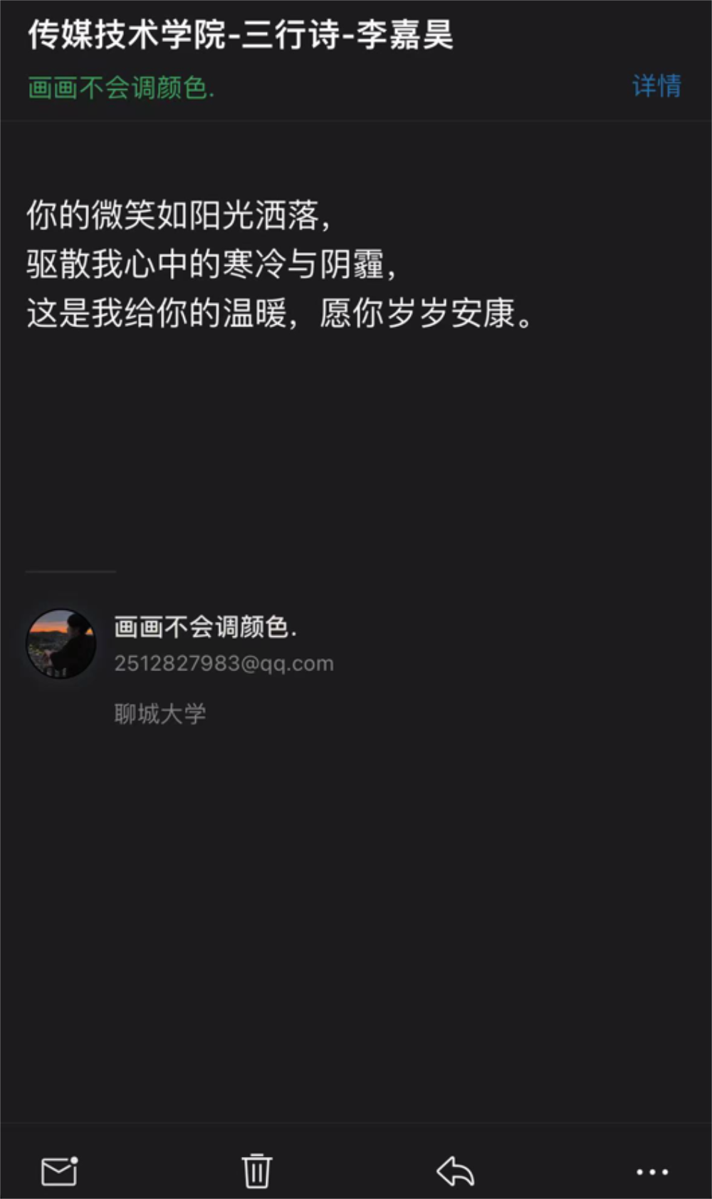 沐浴着盎然春意,青春的诗篇热烈绽放。为激发同学们的诗歌创作热情,传递温暖抒发内心情感诗意浓郁的氛围中,同学们纷纷挥洒着才华与情感,用简洁而深刻的三行诗句,表达着对生活、爱情、梦想的独特见解。大家通过三行诗活动纷纷表示会更加珍惜身边的人和事,用自己的行动去传递温暖和正能量,让校园变得更加美好,以饱满的热情和积极向上的精神风貌迎接校园生活。