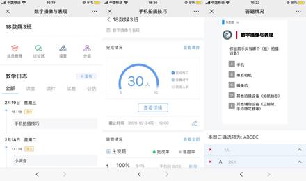 《数字摄像与表现》是一门理论与实践相结合的课程。选择通过雨课堂和QQ群的方式进行网上教学。在雨课堂中可以插入慕课视频以及优酷、腾讯等视频网站的相关教学视频,通过前期的准备,搜索了大量的相关教学视频,制作成了手机教学课件,可以根据课程进度选择发给学生进行课程预习和知识的自主学习。