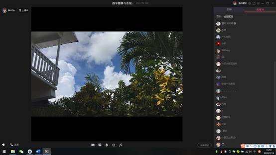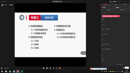 课程直播采用的是QQ群直播上课功能,可以通过演示PPT功能进行课程理论知识的讲解,同时可以通过分享影片或共享屏幕,播放影片片段,针对具体影片案例进行分析和讲解。
