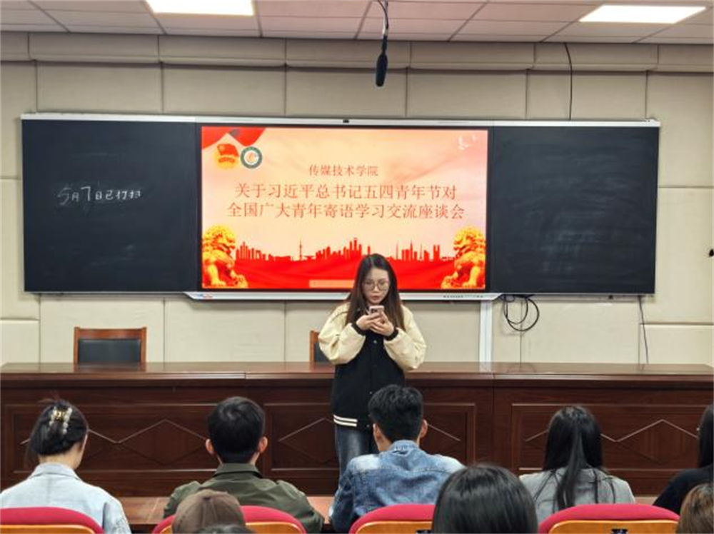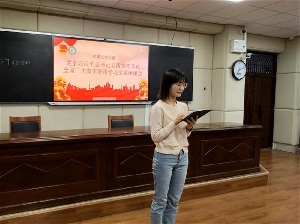于11#A401教室开展关于习近平总书记五四青年节对全国广大青年寄语学习交流座谈会,本次座谈会由学生会主席团成员常金彤主讲,学院学生会、研究生会社团等学生组织骨干成员参与。