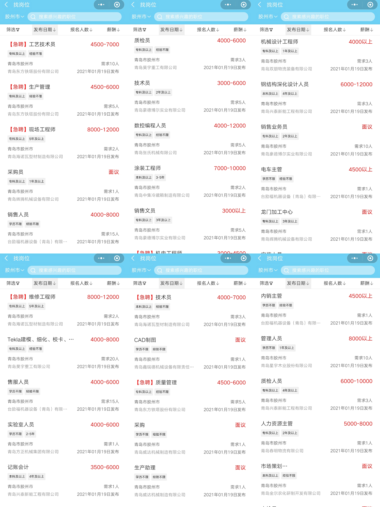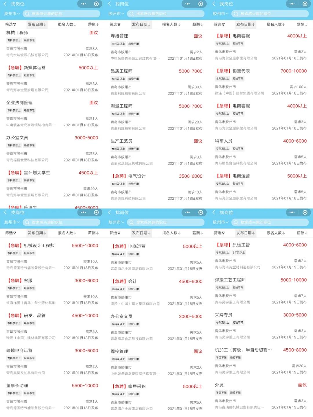 胶州市“青鸟计划”就业服务季暨“青鸟计划 优选山东”2021云招聘岗位征集发布以来,全区各级团组织通过广泛宣传、分类摸排、重点征集、精准对接等方式,深挖优质岗位。截至1月22日,已征集42个企事业单位116个就业岗位,岗位需求数达766人,青年学子们积极行动起来吧!