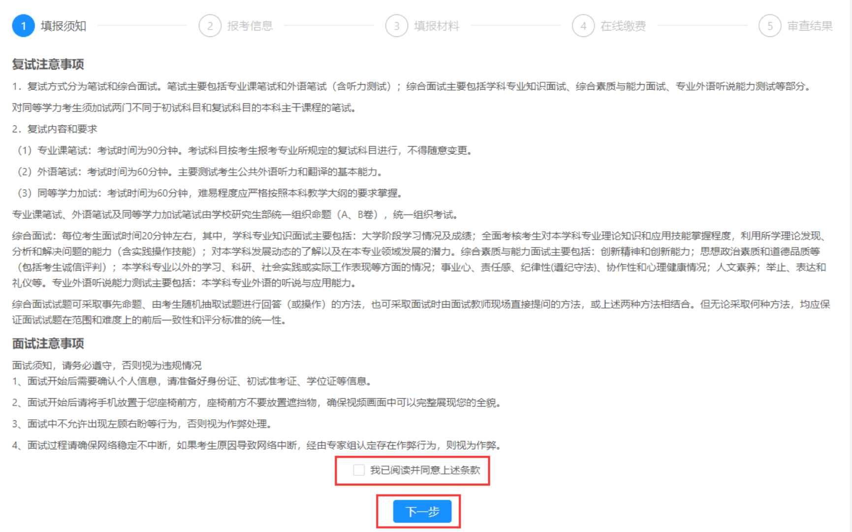 第一步:阅读复试资格审查须知,阅读后勾选“我已阅读并同意上述条款”,然后点击【下一步】。