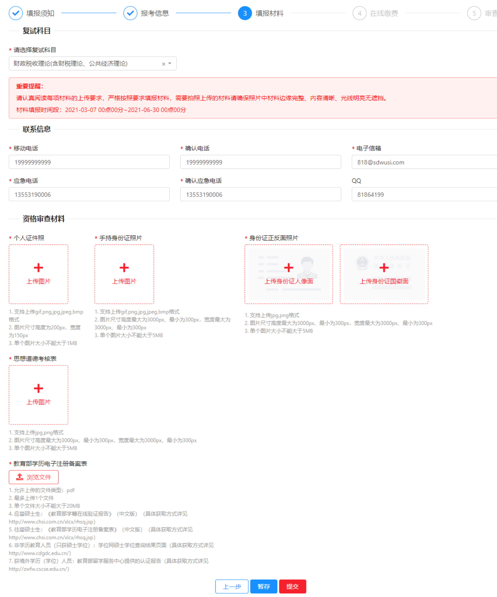 第三步:填报材料。首先选择复试科目,然后填写联系信息,上传审查材料的图片。上传后可以点击【暂存】,如果确认无误也可以直接点击【提交】,提交后无法修改审查材料。(需要填写的材料以实际页面为准)